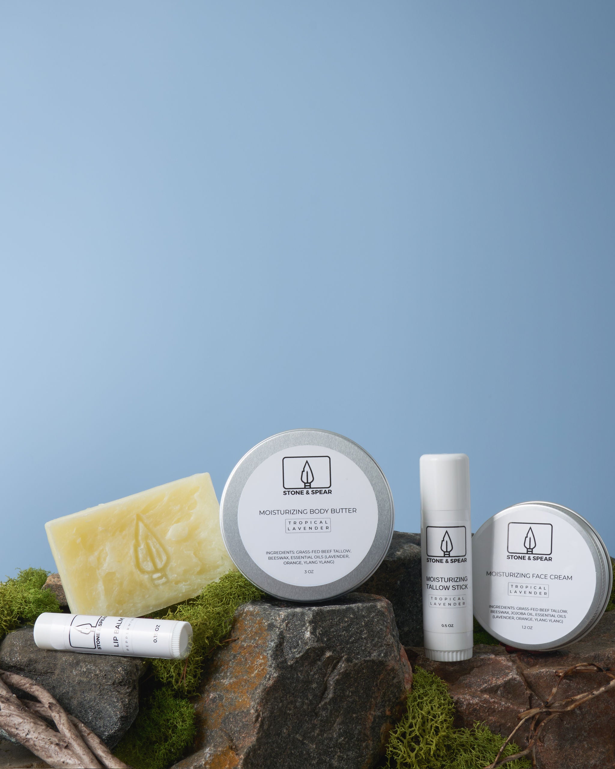 This bundle contains five of our most popular 100% natural moisturizing tallow products: Moisturizing Body Soap, Moisturizing Body Butter, Moisturizing Tallow Stick, Moisturizing Face Cream, and Natural Lip Balm.
