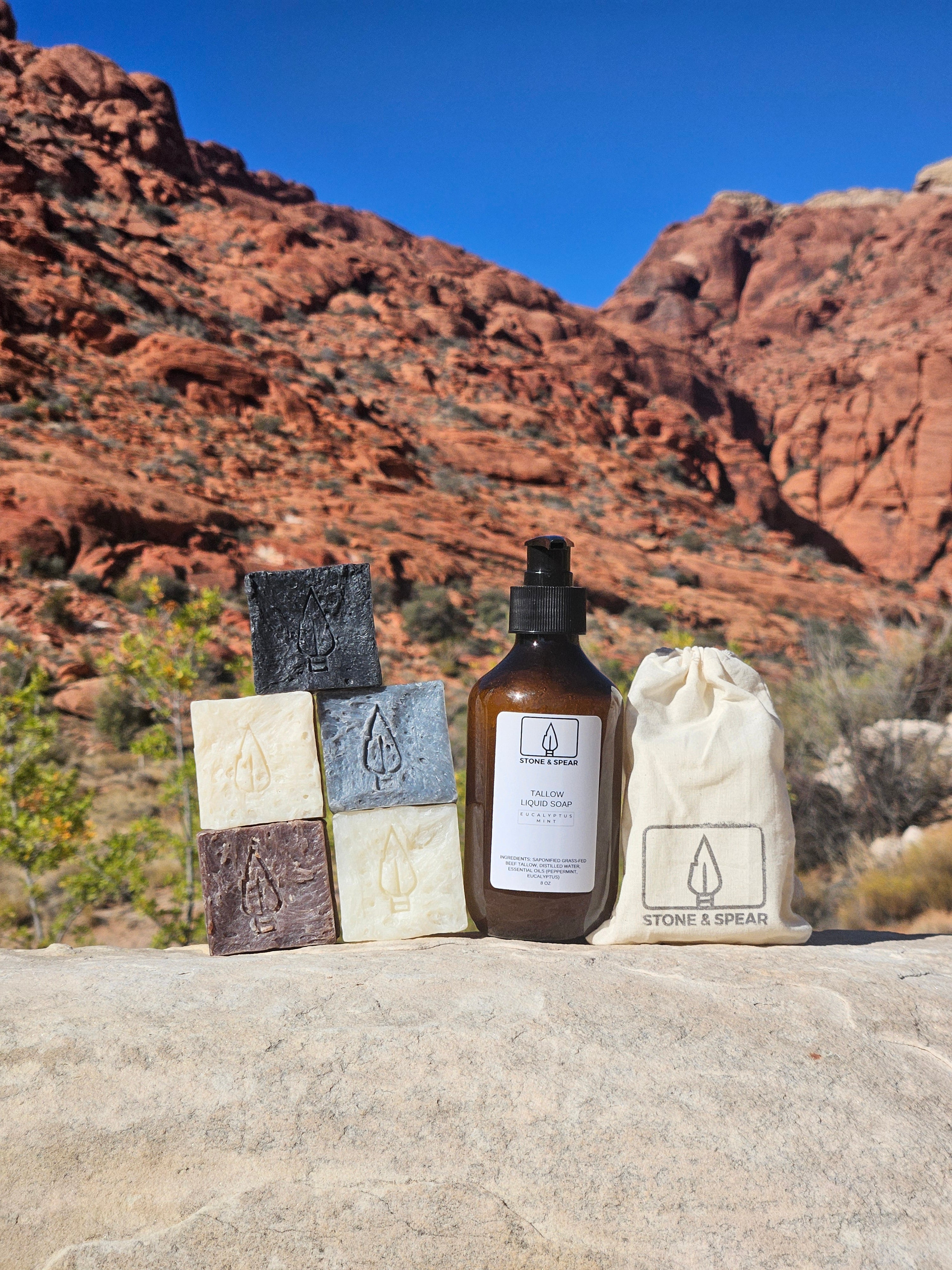 Handcrafted in the USA. This bundle contains an 8 oz bottle of our amazing tallow liquid soap in Citrus Vanilla as well as 2.4 oz samples of our 5 luxurious handcrafted 100% natural tallow soap products in the following scents: Hand & Body Soap (Eucalyptus Mint), Moisturizing Body Soap (Citrus Vanilla), Charcoal Soap (Cedar Citrus), Exfoliating Body Soap (Tropical Lavender), and Exfoliating Facial Cleanser (Unscented).