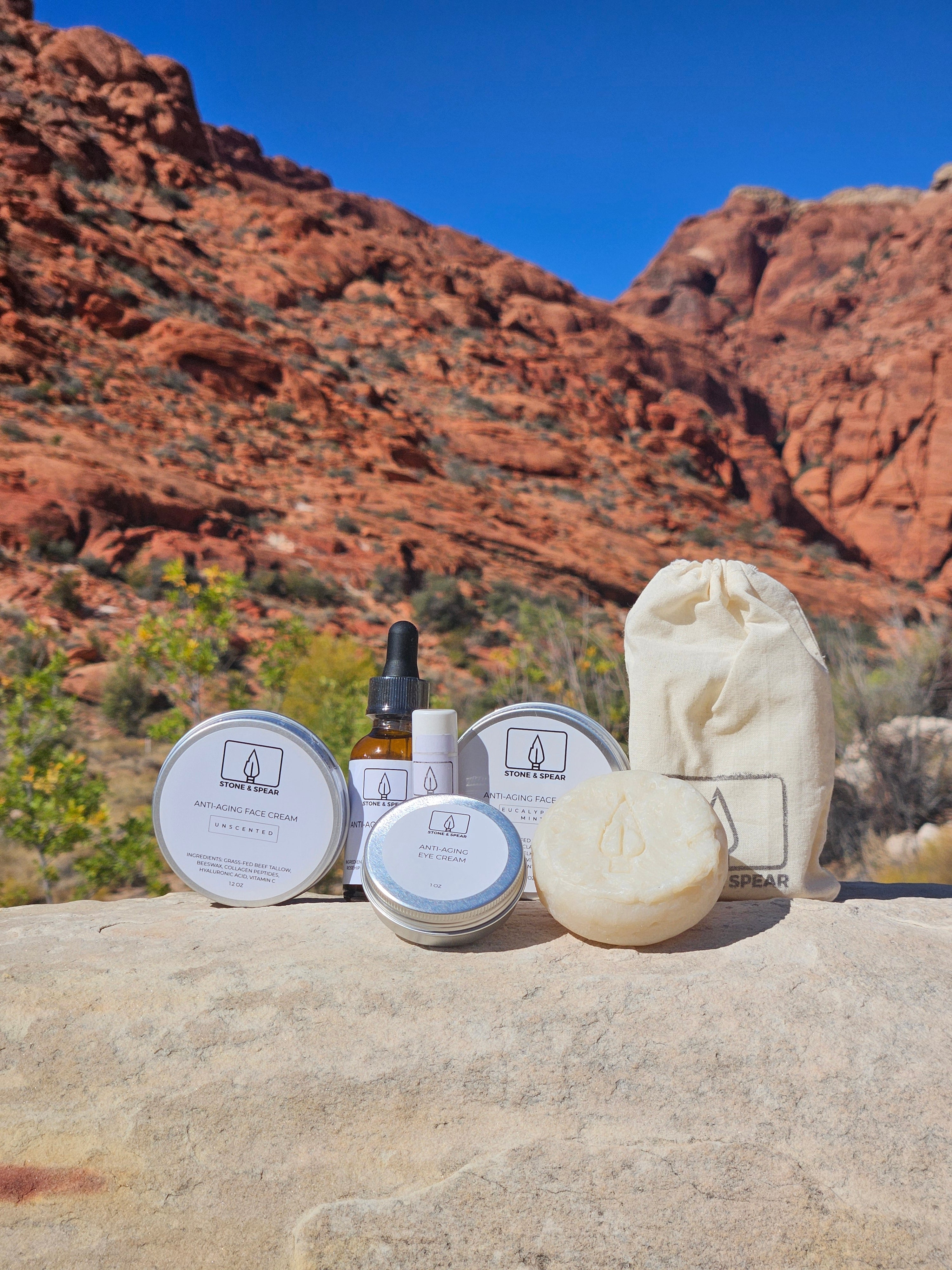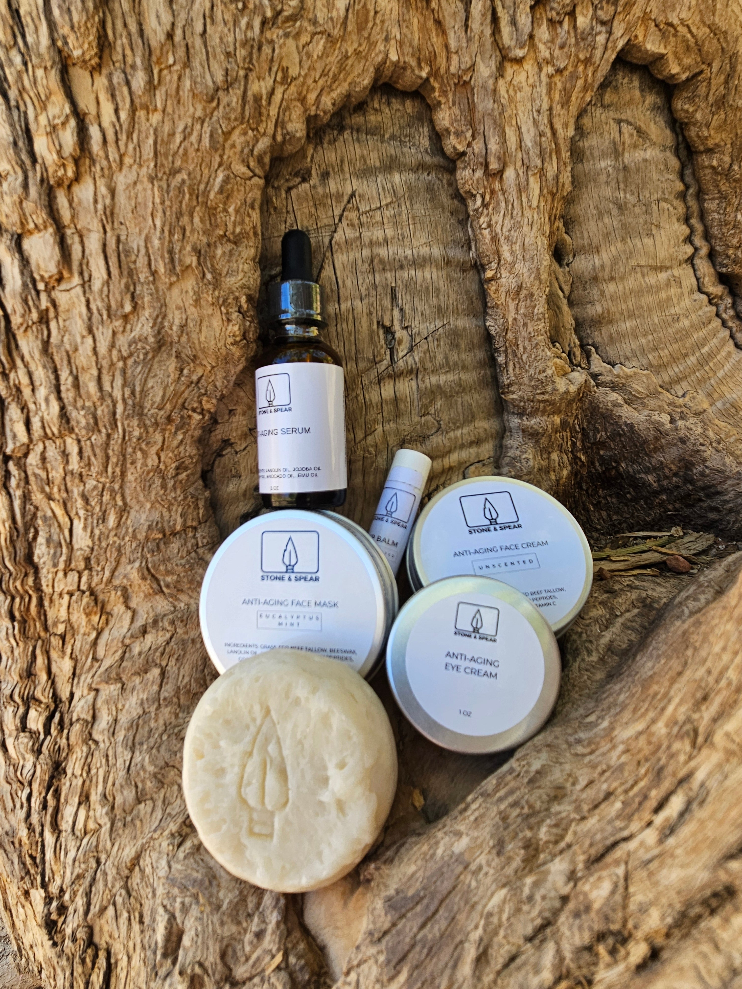 This highly effective anti-aging bundle contains the following 6 best-selling products: Anti-Aging Face Cream, Anti-Aging Eye Cream, Anti-Aging Face Serum, Anti-Aging Face Mask, Exfoliating Face Cleanser, and Natural Lip Balm.