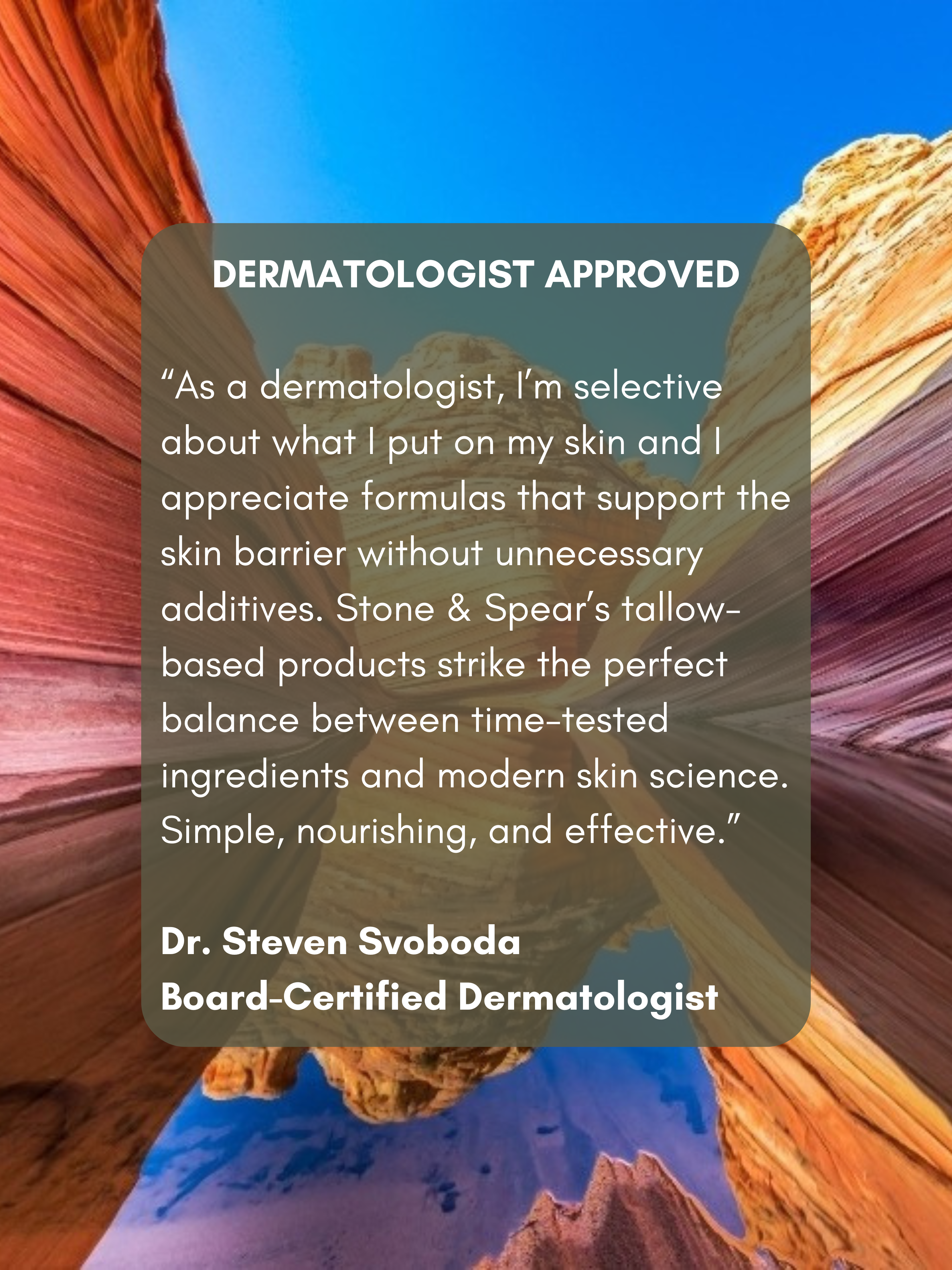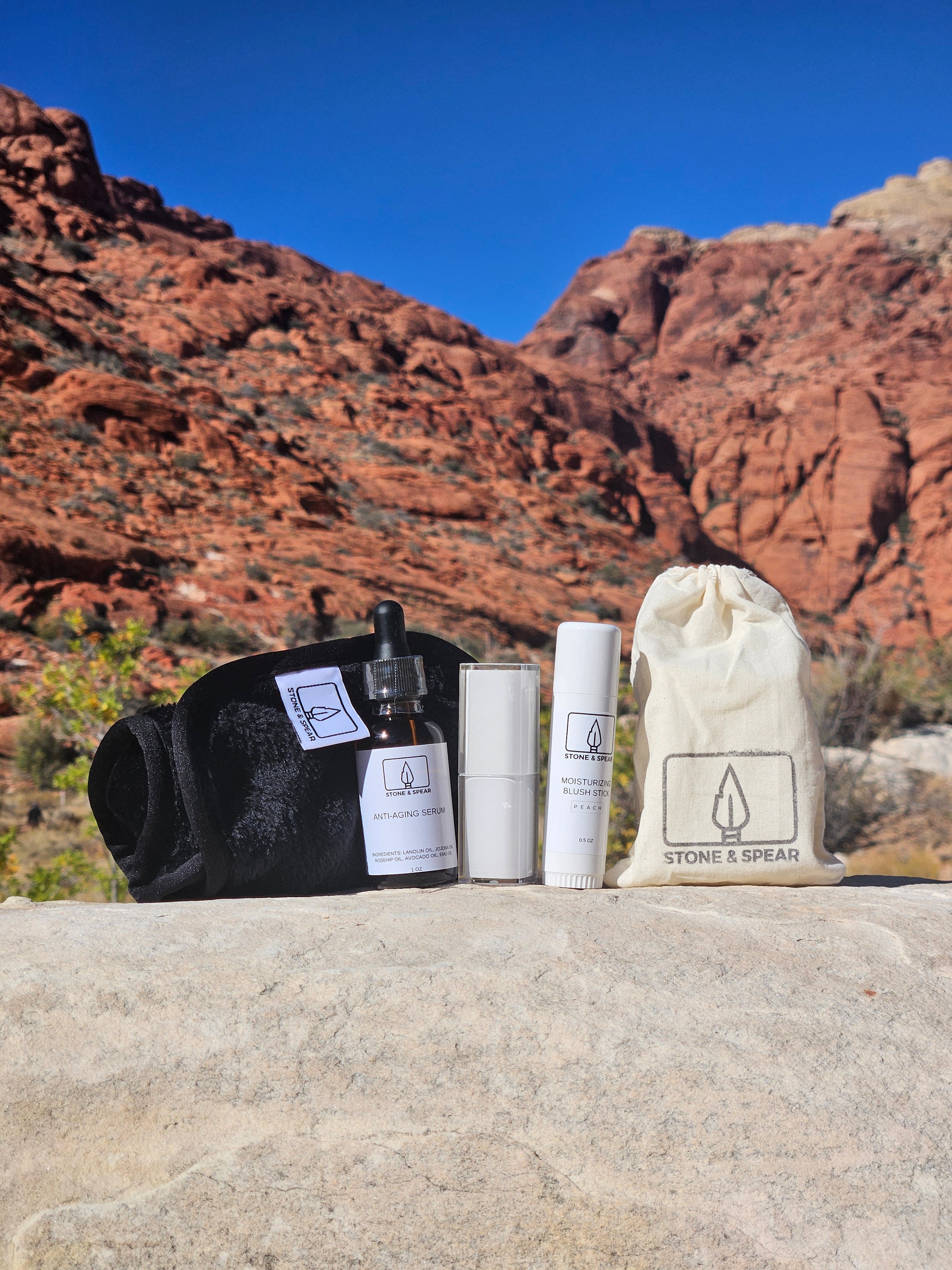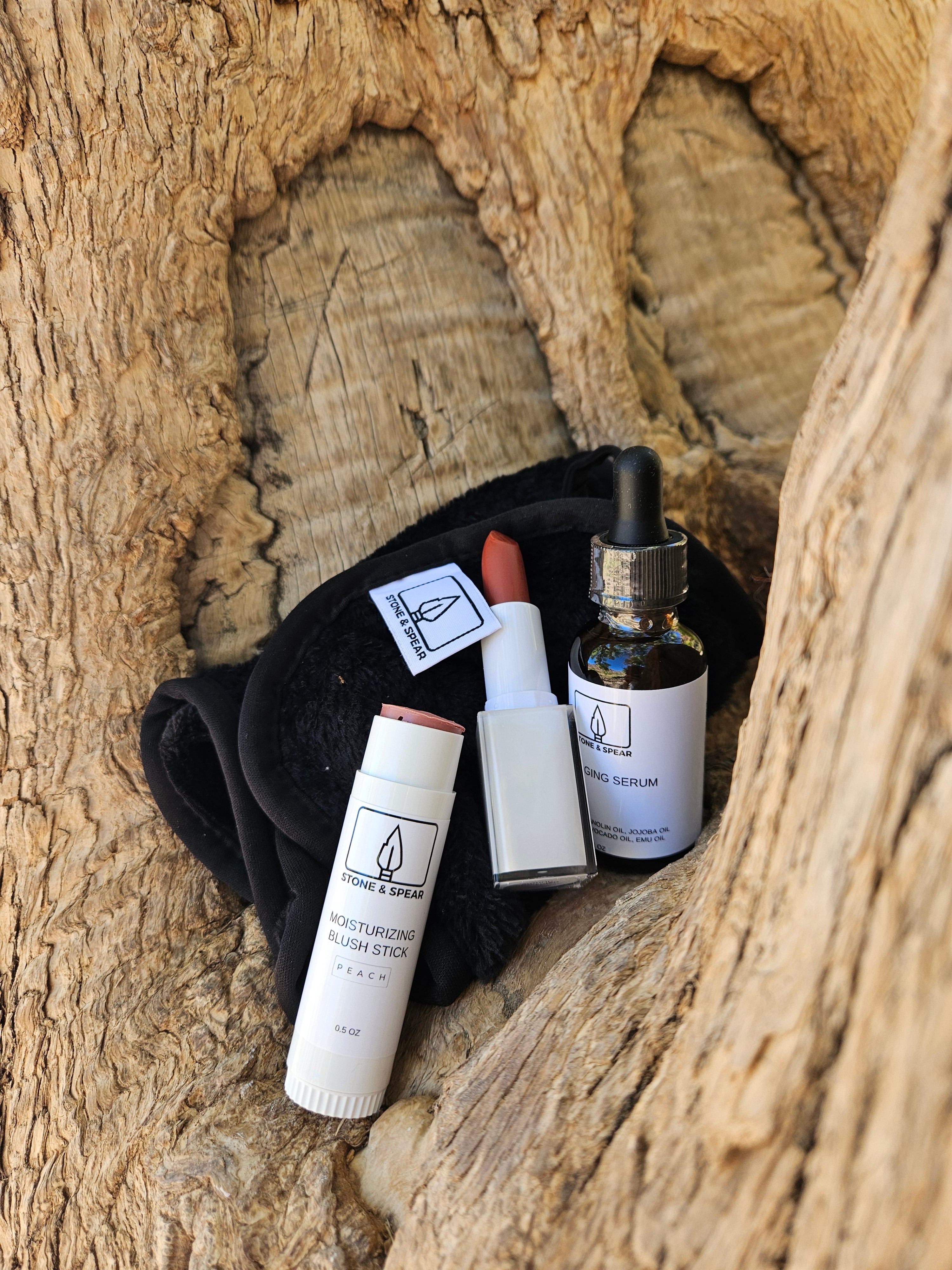Handcrafted in the USA. This bundle contains our best-selling Natural Tallow Lipstick, Moisturizing Blush Stick, Makeup Removing Serum, and a free Stone & Spear makeup removing towel, all of which are completely free from synthetic fragrances, dyes, preservatives, additives, and harsh inflammatory chemicals.
