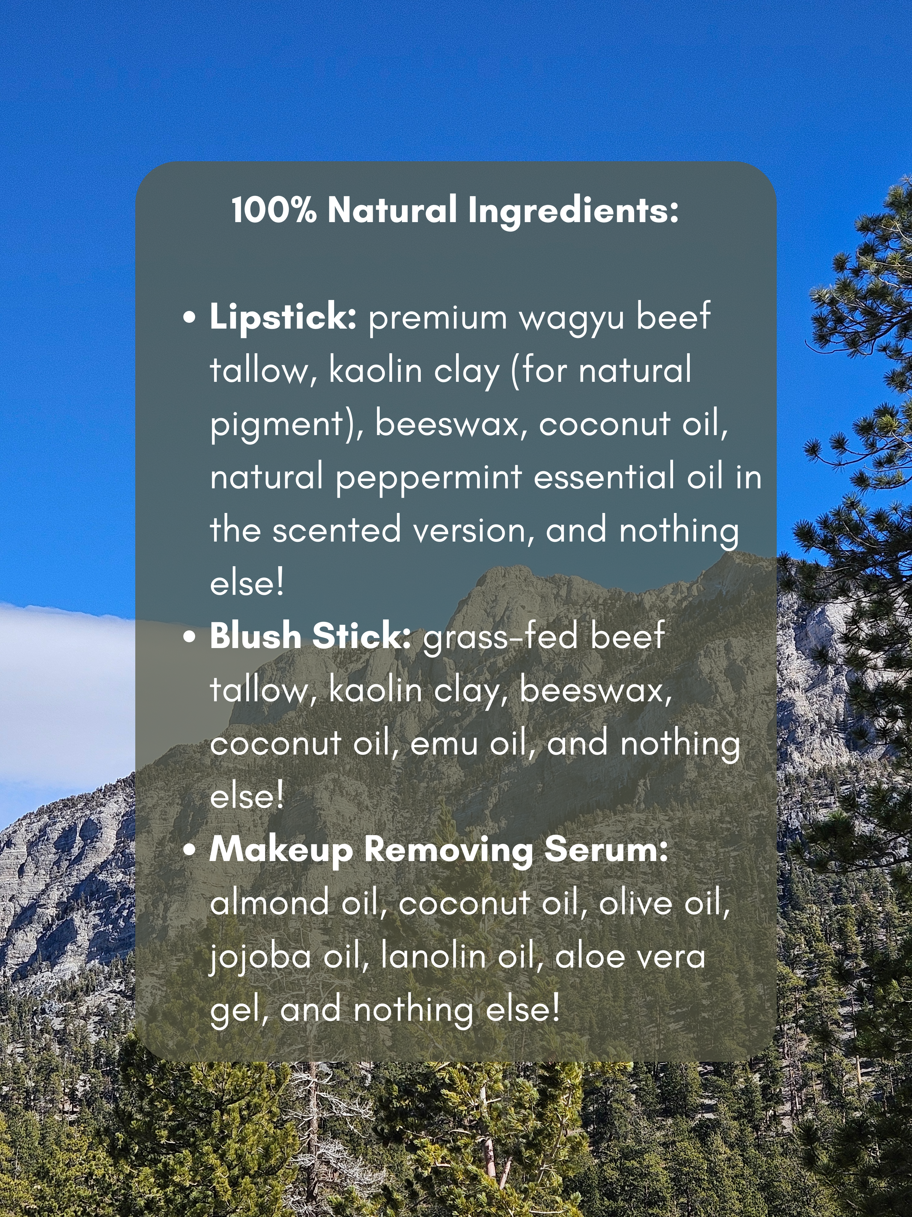 Lipstick Ingredients: premium wagyu beef tallow, kaolin clay (for natural pigment), beeswax, coconut oil, natural peppermint essential oil in the scented version, and nothing else!