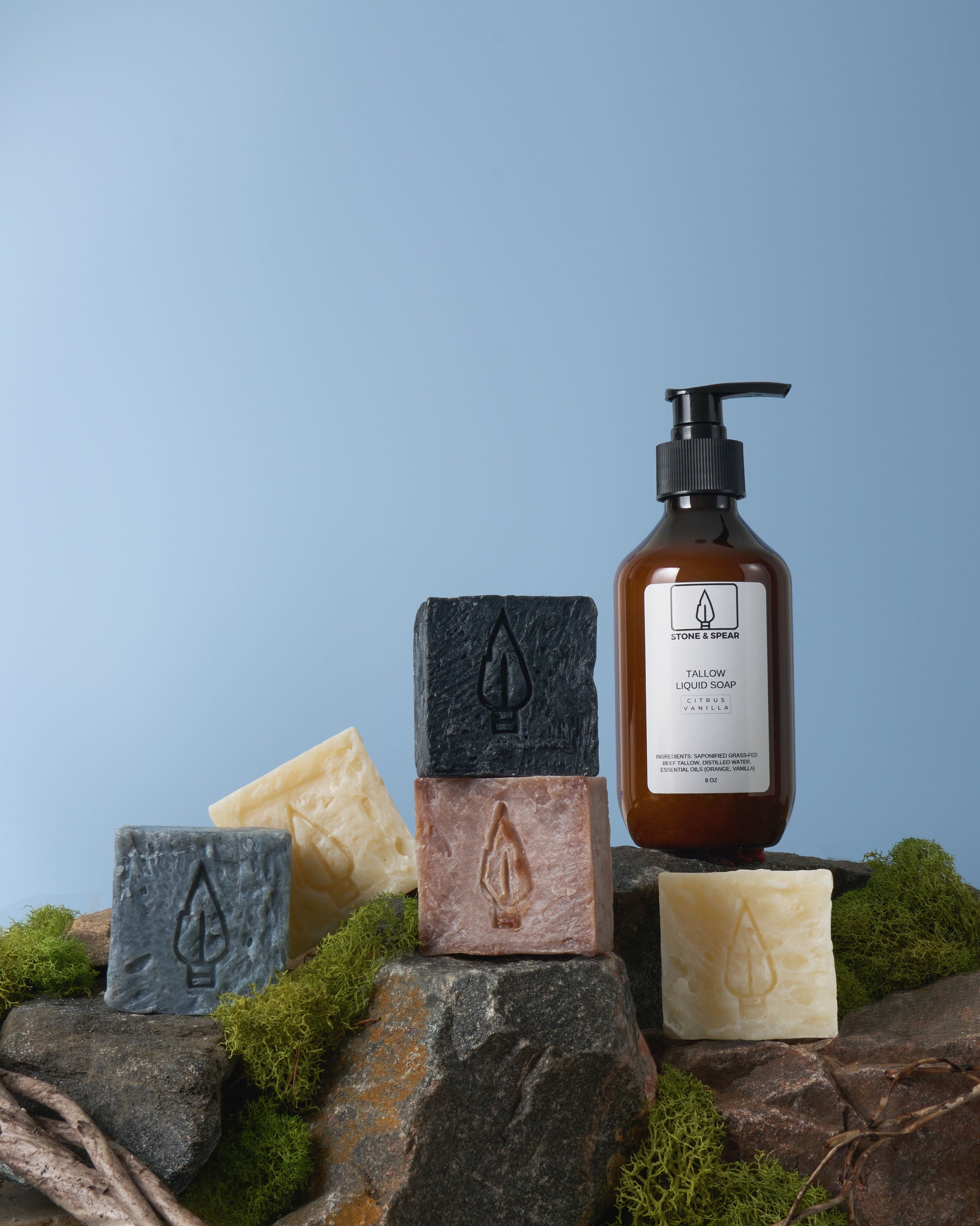 This bundle contains an 8 oz bottle of our amazing tallow liquid soap in Citrus Vanilla as well as 2.4 oz samples of our 5 luxurious handcrafted 100% natural tallow soap products in the following scents: Hand & Body Soap (Eucalyptus Mint), Moisturizing Body Soap (Citrus Vanilla), Charcoal Soap (Cedar Citrus), Exfoliating Body Soap (Tropical Lavender), and Exfoliating Facial Cleanser (Unscented).